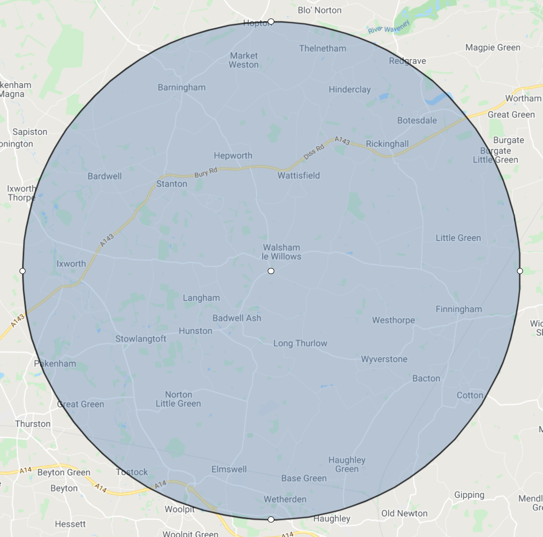 We are based in Walsham Le Willows and we normally provide our services within a 6 mile radius (see map below).